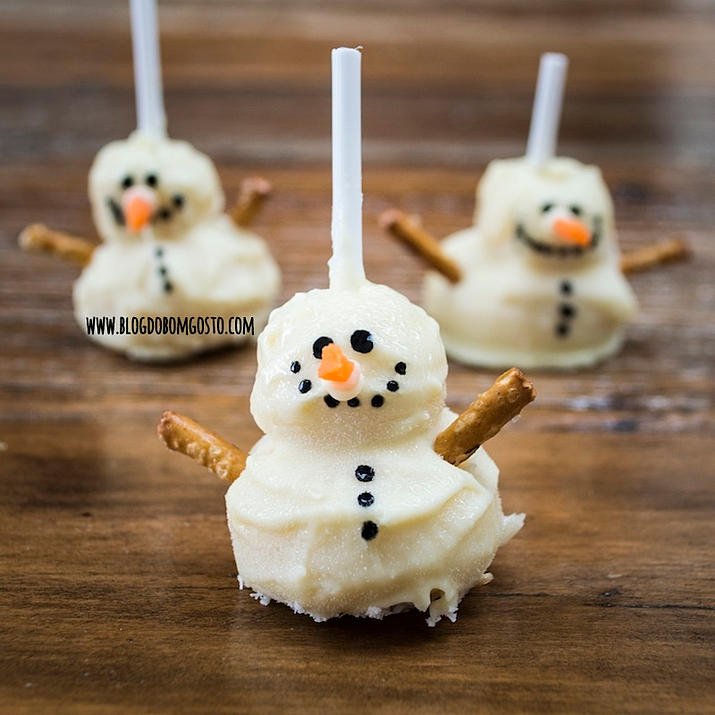 1) Cake Pops ‘Boneco de Neve’: Fáceis, fofos e perfeitos para servir no Natal! O tempo de preparo é de apenas 15 minutos, já que não vão ao forno! Os docinhos ficam parecendo brigadeiros de baunilha.