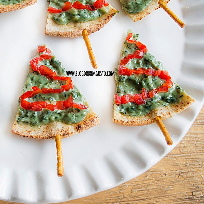 1)  Canapés ‘Árvore de Natal’: Um delicioso patê de gorgonzola com ervas e tomate faz é responsável pelo sabor e pela decoração dessas torradinhas natalinas. Ficam lindas à ponto de dar dó de comer. Mas, ao experimentar, duvido que conseguirá comer uma só!