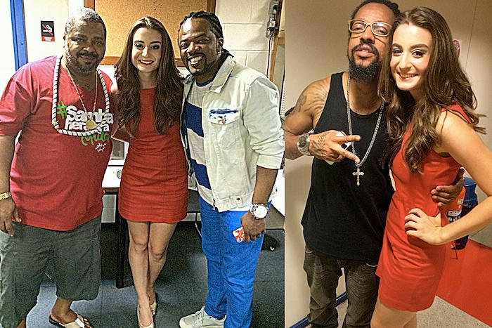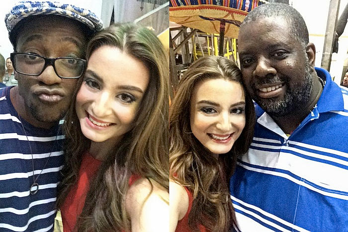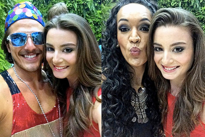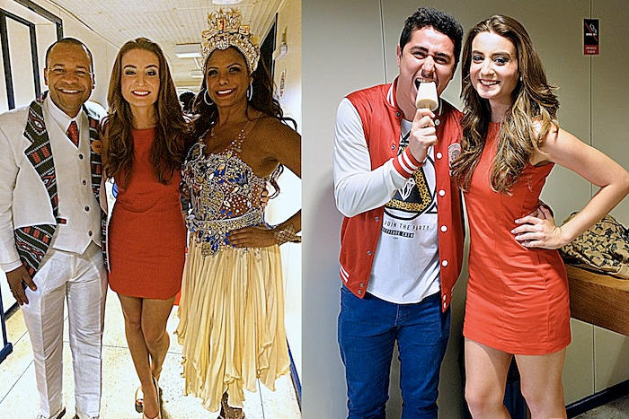 A jornalista ainda conheceu o pessoal da escola de samba Beija-Flor de Nilópolis (à esquerda) e se divertiu com o pessoal da produção do programa (à direita, o produtor Diego Dias)